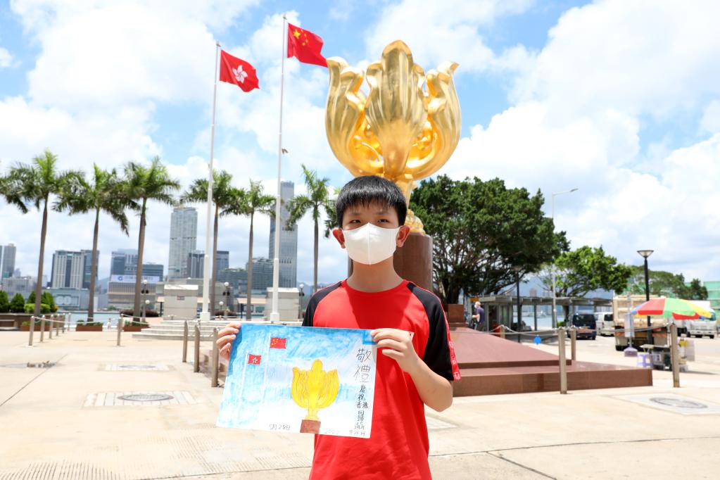 香港小學生曾祥珂帶著自己的畫作《敬禮——慶祝香港回歸25周年》,在父母陪伴下來到金紫荊廣場留影,迎接香港回歸25周年。新華社記者 吳曉初 攝