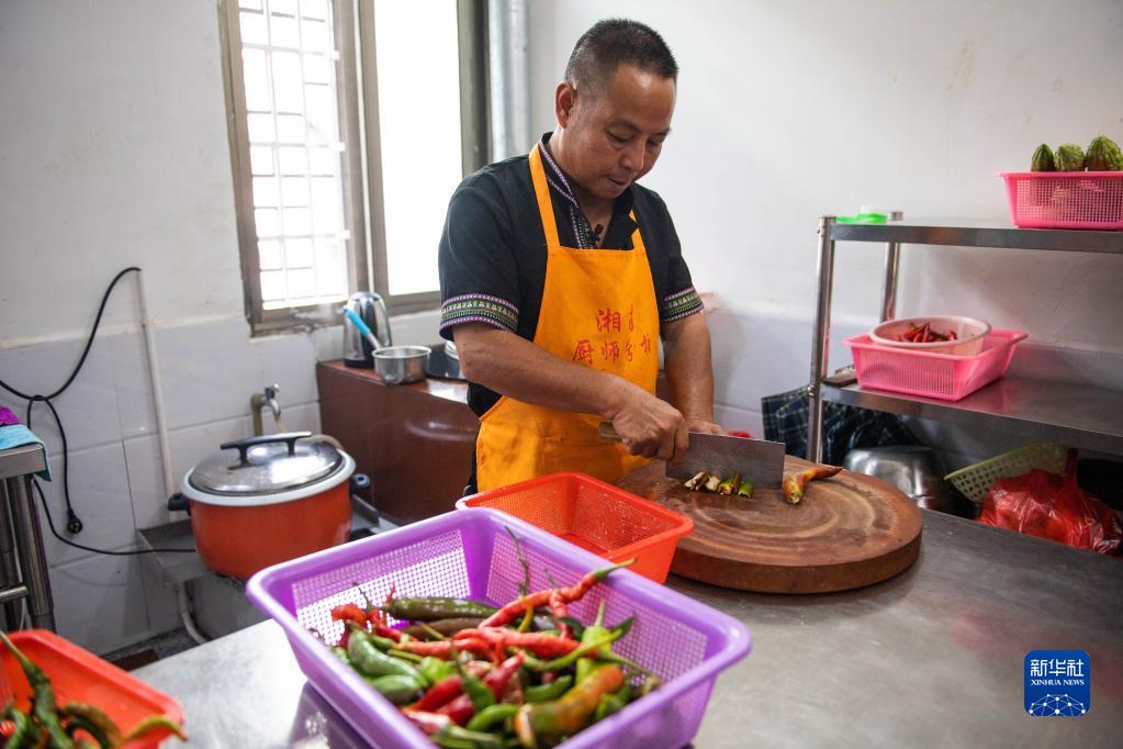 2020年9月17日,在汝城縣沙洲瑤族村,朱小紅在自家開的農(nóng)家樂廚房里切菜。新華社記者 陳思汗 攝