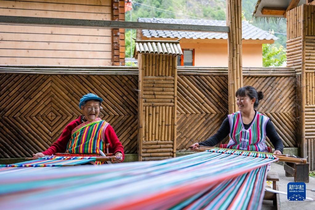 在云南省貢山獨龍族怒族自治縣獨龍江鄉(xiāng)迪政當(dāng)村,獨龍族老人李文仕(左)和女兒在編織獨龍?zhí)海?月10日攝)。新華社記者 曹夢瑤 攝