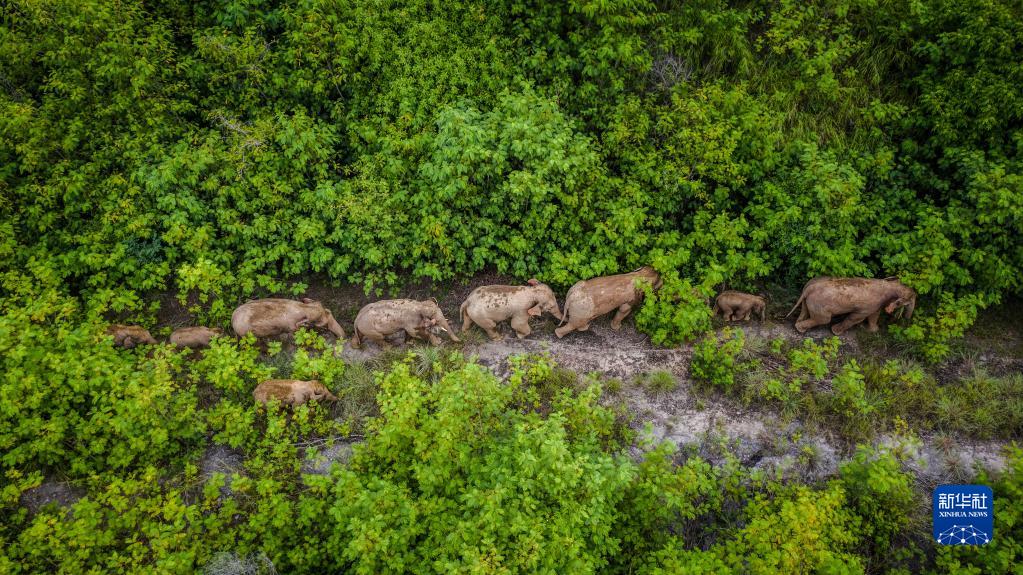 這是在云南省玉溪市元江縣境內(nèi)拍攝的象群(無人機照片,2021年8月9日攝)。新華社記者 胡超 攝