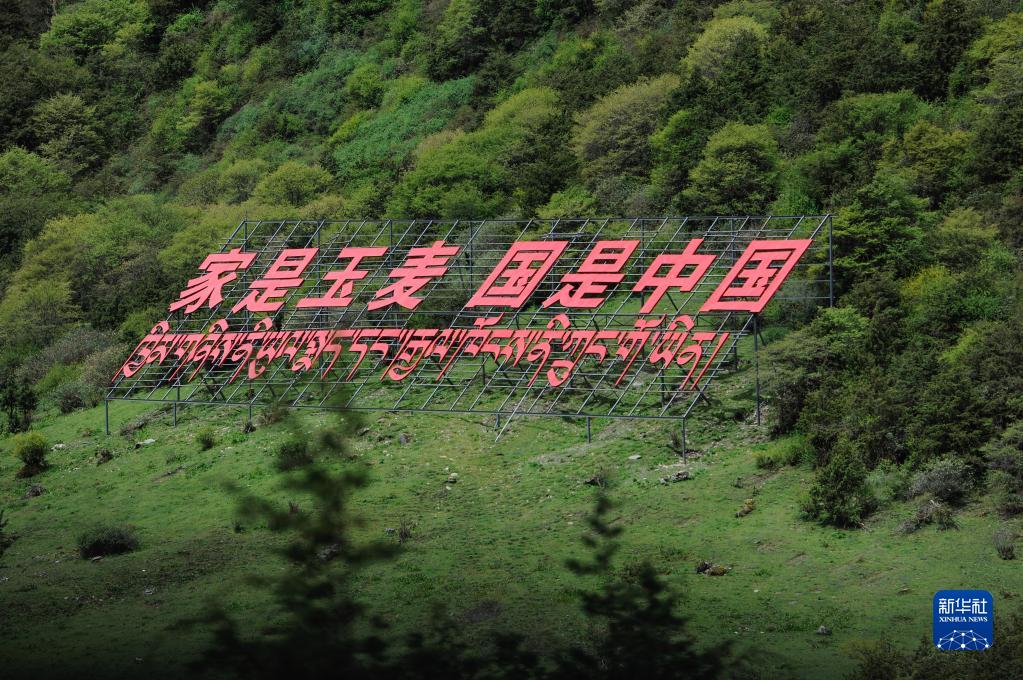 玉麥鄉(xiāng)山坡上的標(biāo)語(yǔ)(6月1日攝)。新華社記者 張汝鋒 攝