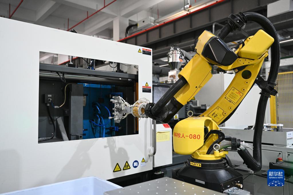 在福建省南安市九牧高端燈塔工廠,機(jī)械臂在流水線上作業(yè)(2022年5月18日攝)。新華社發(fā)(周義 攝)