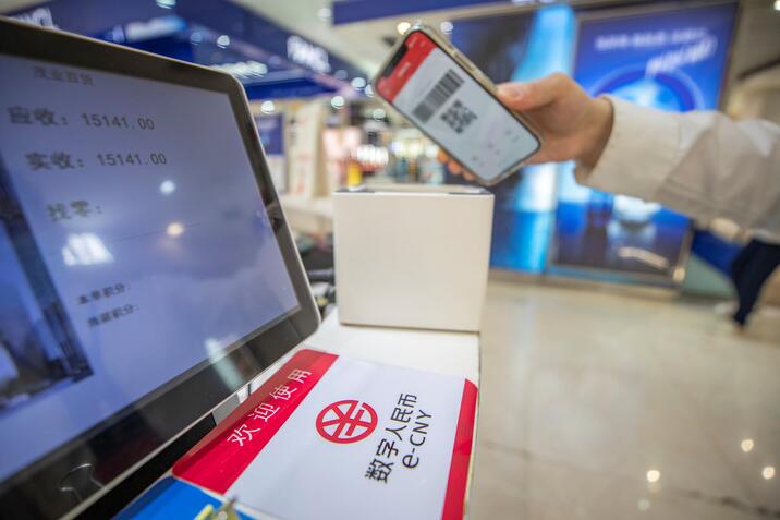 5月3日,一名重慶消費(fèi)者在商場(chǎng)收銀臺(tái)使用數(shù)字人民幣進(jìn)行支付。新華社記者 黃偉 攝