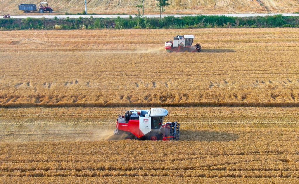 2022年6月8日,在河南省安陽市湯陰縣菜園鎮(zhèn)高標(biāo)準(zhǔn)農(nóng)田示范區(qū),收割機在麥田作業(yè)(無人機照片)。新華社記者郝源攝