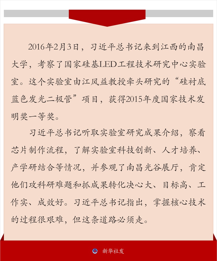 習近平總書記聽取實驗室研究成果介紹,察看芯片制作流程,了解實驗室科技創(chuàng)新、人才培養(yǎng)、產(chǎn)學研結(jié)合等情況,并參觀了南昌光谷展廳,肯定他們攻科研難題和抓成果轉(zhuǎn)化決心大、目標高、工作實、成效好。習近平總書記指出,掌握核心技術(shù)的過程很艱難,但這條道路必須走。
