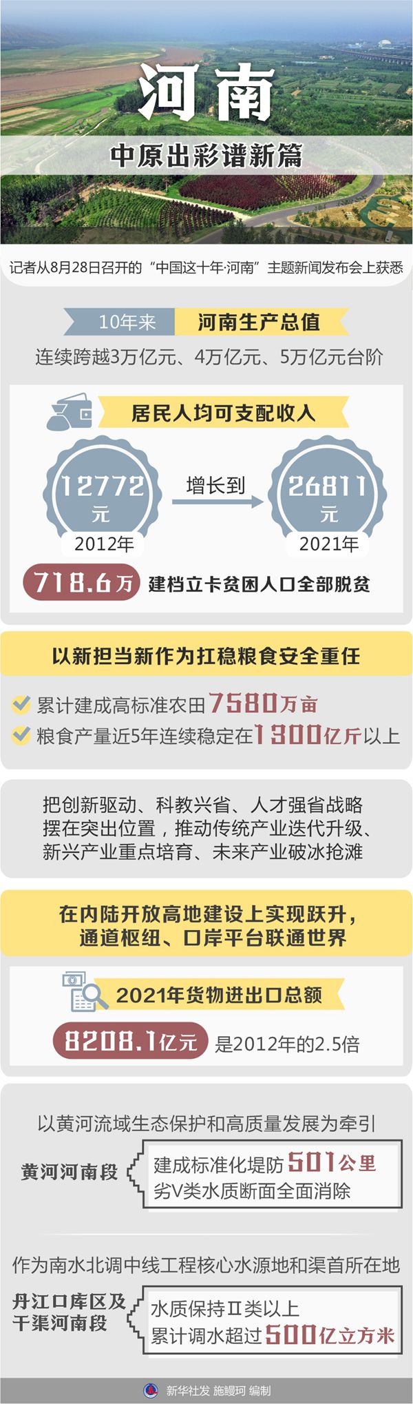 10年來,河南生產(chǎn)總值連續(xù)跨越3萬億元、4萬億元、5萬億元臺階,居民人均可支配收入從2012年的12772元增長到2021年的26811元,718.6萬建檔立卡貧困人口全部脫貧。