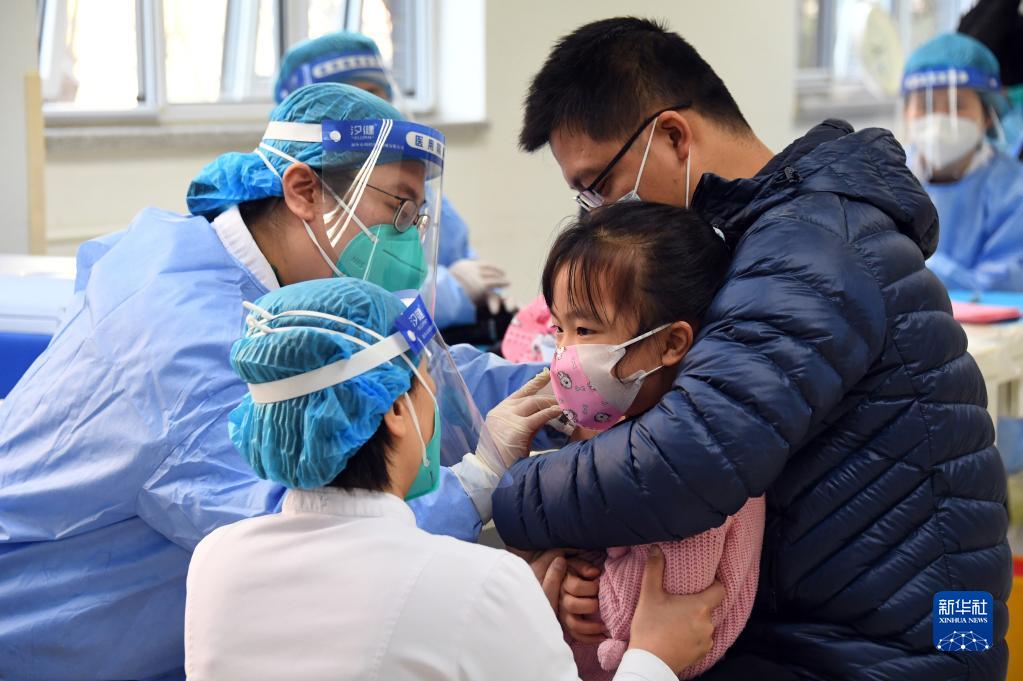 在北京市海淀區(qū)學(xué)院路街道新冠疫苗接種點(diǎn),醫(yī)護(hù)人員為一名小朋友接種新冠疫苗(2021年11月13日攝)。新華社記者 任超 攝