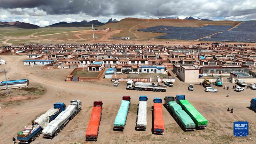 在西藏那曲市雙湖縣多瑪鄉(xiāng)仲魯瑪村,運(yùn)輸家具的貨車整裝待發(fā)(2022年7月13日攝,無人機(jī)照片)。新華社記者 晉美多吉 攝