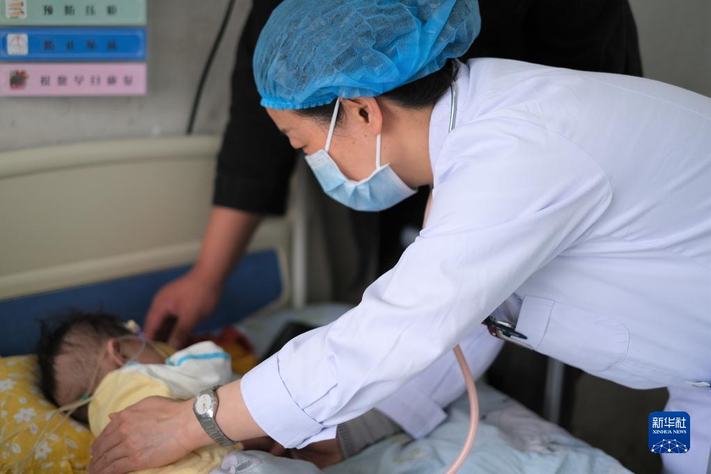 青海省婦女兒童醫(yī)院醫(yī)生、青南支醫(yī)隊(duì)員孫敬在青海省玉樹藏族自治州人民醫(yī)院給患者檢查身體(2022年4月25日攝)。新華社記者 韓方方 攝