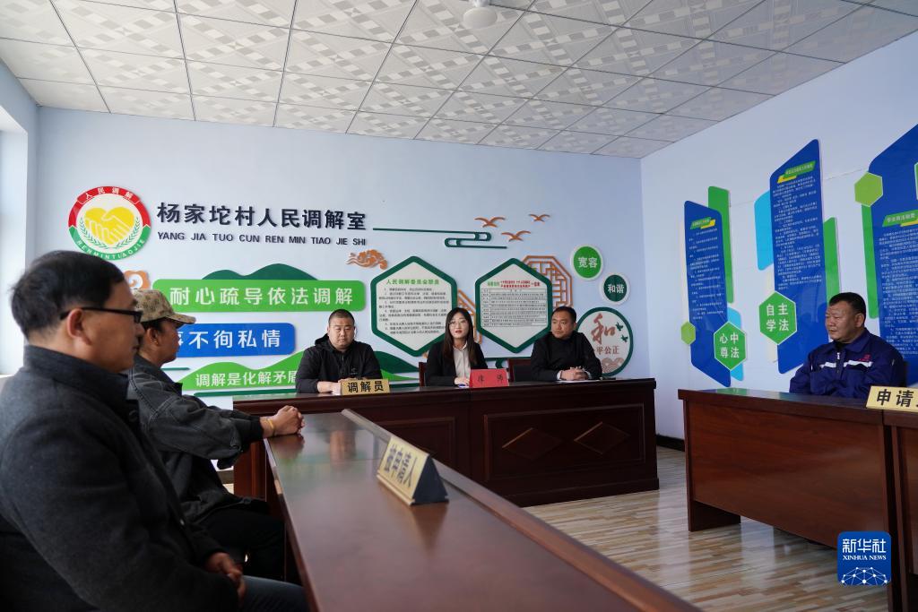 律師甄彩麗(中)在河北唐山灤州市茨榆坨鎮(zhèn)楊家坨村人民調(diào)解室內(nèi)為群眾解答法律問題(2021年4月18日攝)。新華社記者 牟宇 攝