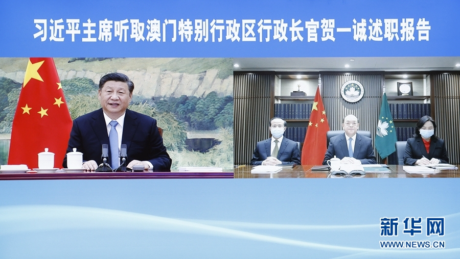 1月27日,國家主席習(xí)近平在北京以視頻連線方式聽取了澳門特別行政區(qū)行政長官賀一誠2020年度的述職報告。新華社記者 劉彬 攝