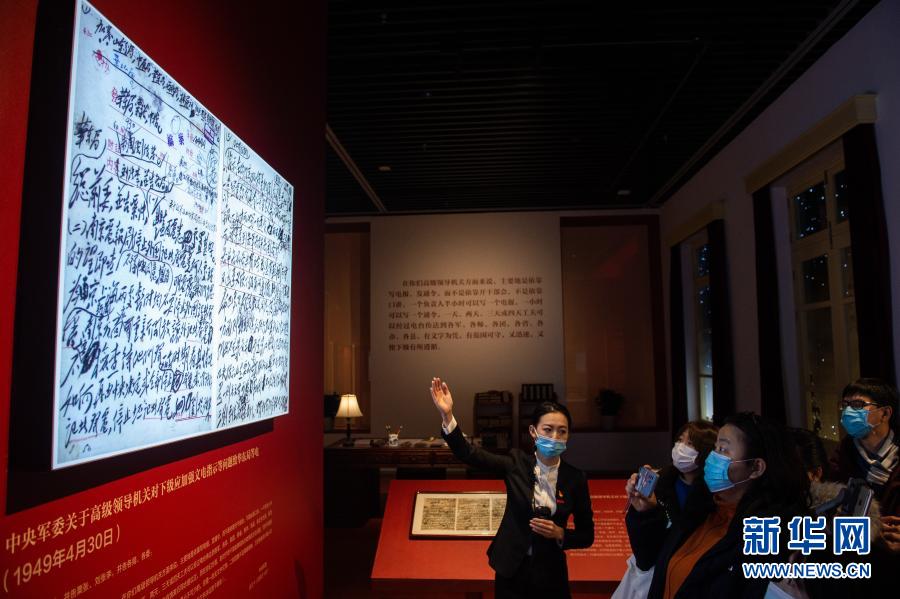 “毛澤東同志香山時(shí)期發(fā)布電報(bào)手稿專題展覽”在北京香山革命紀(jì)念館開(kāi)展,講解員(左一)向媒體記者介紹電報(bào)內(nèi)容(2020年12月16日攝)。新華社記者 陳鐘昊 攝