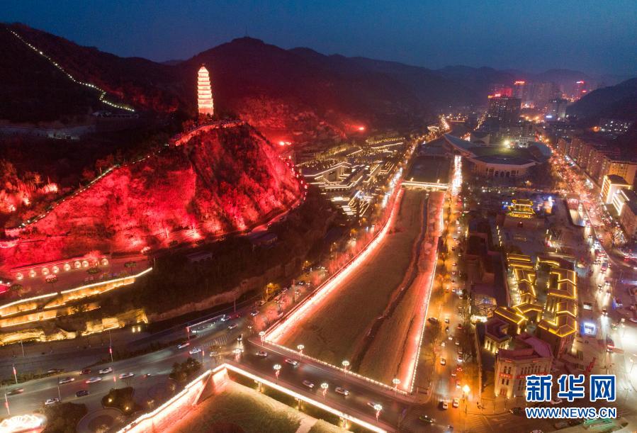 寶塔山下延安城區(qū)夜景(2月8日攝,無(wú)人機(jī)照片)。新華社記者 邵瑞 攝