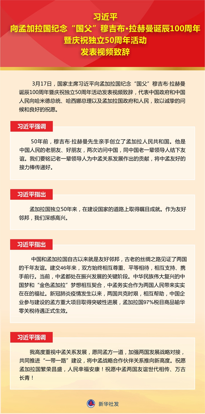 新華社北京 3 月 17 日電 3 月 17 日,國(guó)家主席習(xí)近平向孟加拉國(guó)紀(jì)念 “ 國(guó)父 ” 穆吉布 · 拉赫曼誕辰 100 周年暨慶祝獨(dú)立 50 周年活動(dòng)發(fā)表視頻致辭,代表中國(guó)政府和中國(guó)人民向哈米德總統(tǒng)、哈西娜總理以及孟加拉國(guó)政府和人民,致以誠(chéng)摯的問候和良好的祝愿。