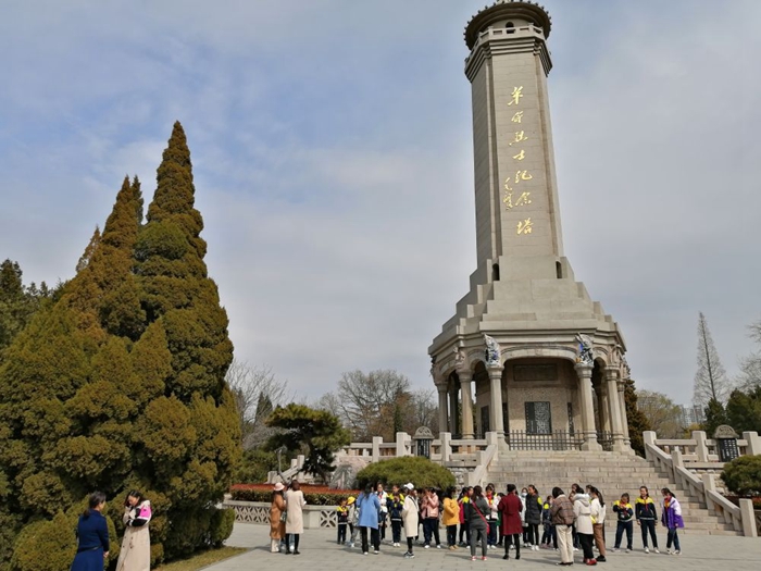 2021年3月18日,小小紅色講解員在位于烈士陵園中央的革命烈士紀(jì)念塔前,學(xué)生們在學(xué)習(xí)講解知識的同時也接受紅色教育。新華社記者楊文 攝