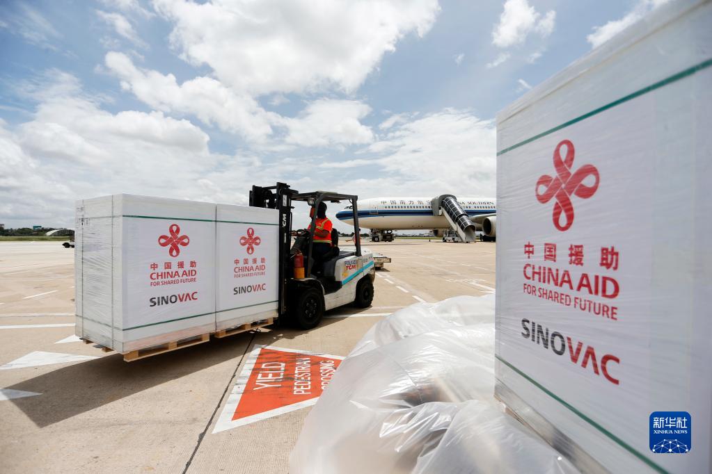 工作人員在柬埔寨金邊國際機(jī)場運(yùn)輸中國政府援助柬埔寨的科興新冠疫苗(2021年10月14日攝)。新華社發(fā)(批隆 攝)