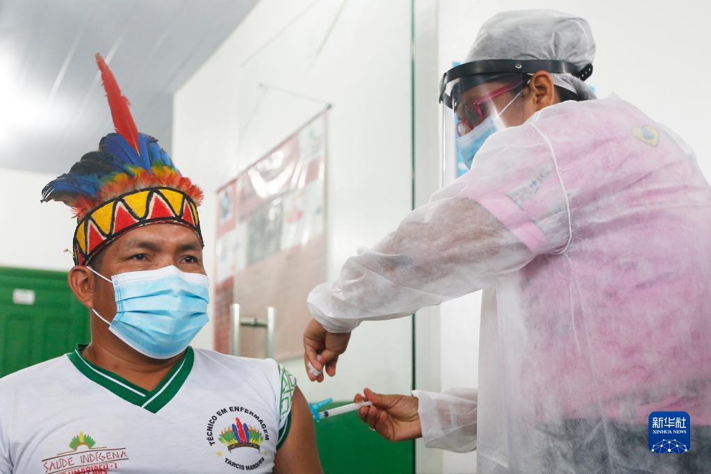 醫(yī)護(hù)人員在巴西亞馬孫州塔巴廷加市為一名原住民接種中國(guó)新冠疫苗(2021年1月19日攝)。新華社發(fā)(盧西奧·塔沃拉攝)
