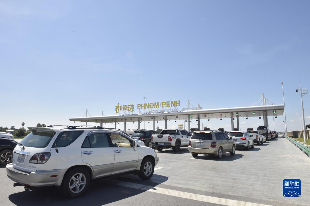 車輛在柬埔寨首都金邊的金港高速公路入口處排隊(duì)(2022年11月7日攝)。新華社記者 吳長(zhǎng)偉 攝