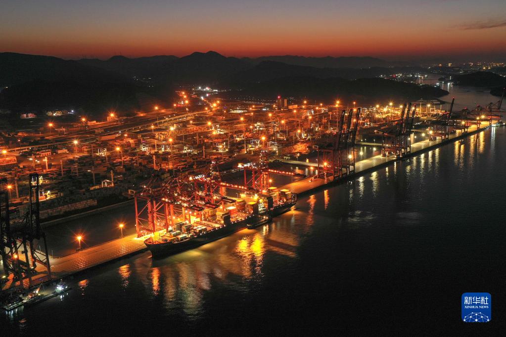 夜幕下,一艘貨輪停靠在寧波舟山港穿山港區(qū)集裝箱碼頭(2023年1月31日攝,無人機(jī)照片)。2022年寧波舟山港完成年貨物吞吐量超12.5億噸,連續(xù)14年位居全球第一;完成集裝箱吞吐量3335萬標(biāo)準(zhǔn)箱,位居全球第三。新華社記者 黃宗治 攝