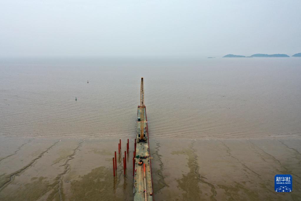 工程人員在通蘇嘉甬高鐵杭州灣跨海鐵路大橋施工現(xiàn)場(chǎng)鋪設(shè)棧橋,為后期工程做準(zhǔn)備(2023年2月1日攝,無人機(jī)照片)。2022年11月30日開工建設(shè)的通蘇嘉甬高鐵杭州灣跨海鐵路大橋全程跨海,總長(zhǎng)約29.2公里,為設(shè)計(jì)時(shí)速350公里的雙線高速鐵路橋,是目前世界上在建長(zhǎng)度最長(zhǎng)、建設(shè)標(biāo)準(zhǔn)最高的高速鐵路跨海大橋。新華社記者 黃宗治 攝