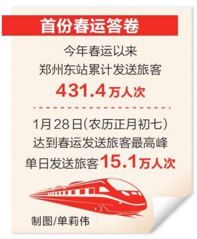 2月15日,為期40天的春運(yùn)圓滿收官。作為全國首個(gè)“米”字形高鐵樞紐,今年春運(yùn)以來鄭州東站客流持續(xù)保持高位運(yùn)行,累計(jì)發(fā)送旅客431.4萬人次,1月28日(農(nóng)歷正月初七)達(dá)到春運(yùn)發(fā)送旅客最高峰,單日發(fā)送旅客15.1萬人次,交出了首份春運(yùn)答卷。