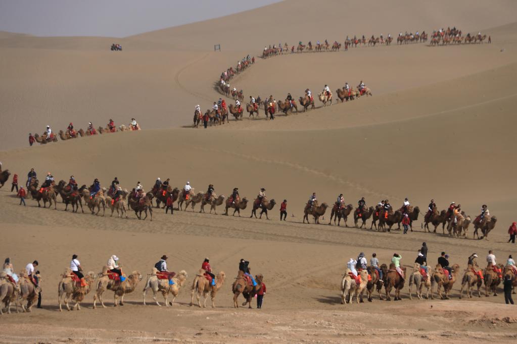 “2400多峰駱駝全部‘上崗’,從早到晚忙不過(guò)來(lái)!原本40分鐘的路程現(xiàn)在要走1小時(shí)左右。”敦煌鳴沙山月牙泉景區(qū)負(fù)責(zé)人說(shuō)。