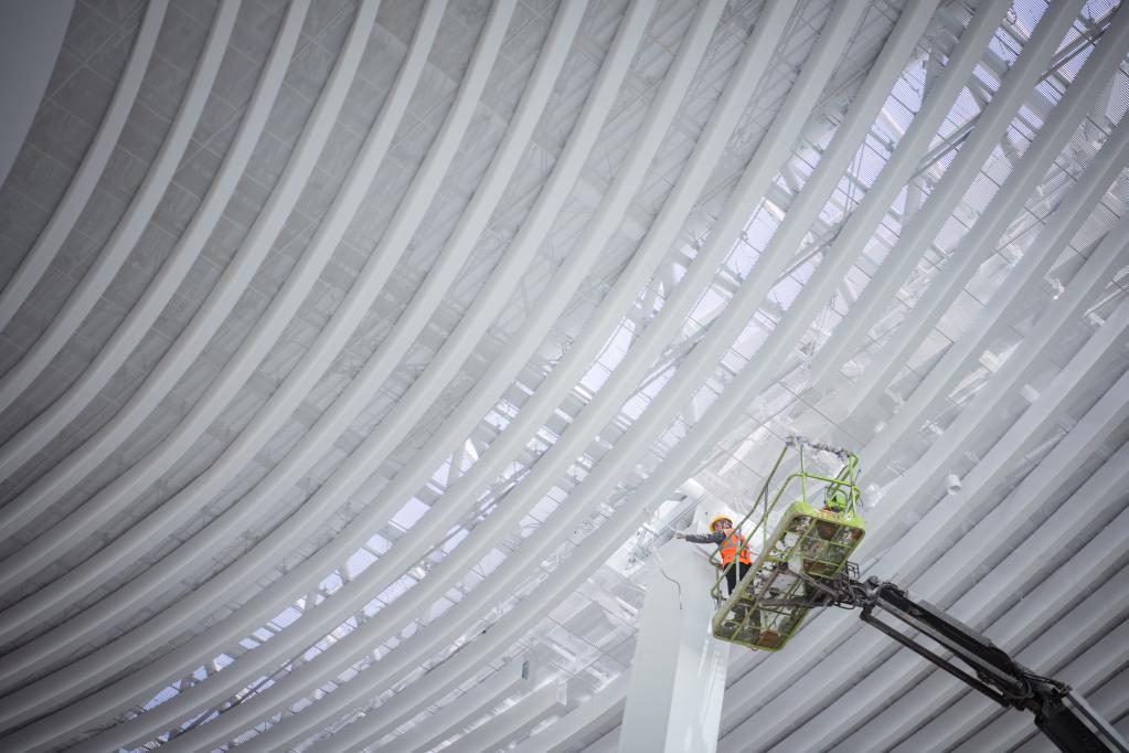5月1日,在中建三局承建的武漢天河機(jī)場(chǎng)T2航站樓改造工程項(xiàng)目工地,工人檢查吊頂內(nèi)管線。新華社記者 伍志尊 攝