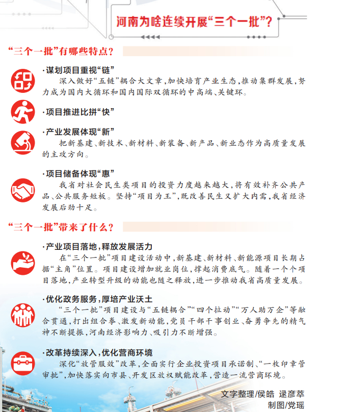 抓項(xiàng)目就是抓發(fā)展,謀項(xiàng)目就是謀未來。我省堅(jiān)持項(xiàng)目為王理念,舉行第八期“三個(gè)一批”項(xiàng)目建設(shè)活動(dòng),又一批含新量、含綠量、含金量高的項(xiàng)目簽約、開工、投產(chǎn),項(xiàng)目建設(shè)再掀熱潮,各地點(diǎn)燃高質(zhì)量發(fā)展“強(qiáng)引擎”。