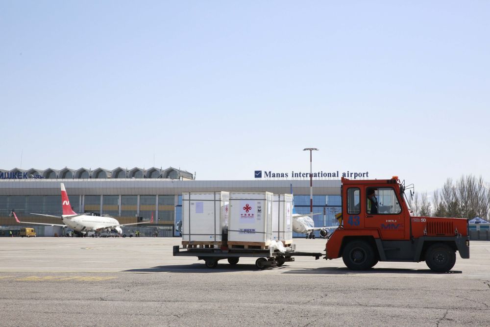 在吉爾吉斯斯坦比什凱克瑪納斯國際機(jī)場,工人轉(zhuǎn)運(yùn)新冠疫苗(2021年3月19日攝)。新華社發(fā)(羅曼攝)