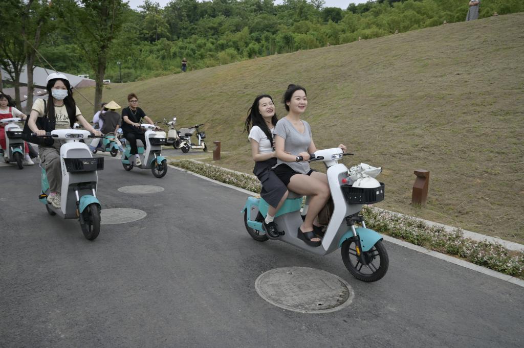 6月5日,在浙江省湖州市安吉縣天荒坪鎮(zhèn)余村,年輕人騎共享電動(dòng)車游玩。新華社記者才揚(yáng) 攝