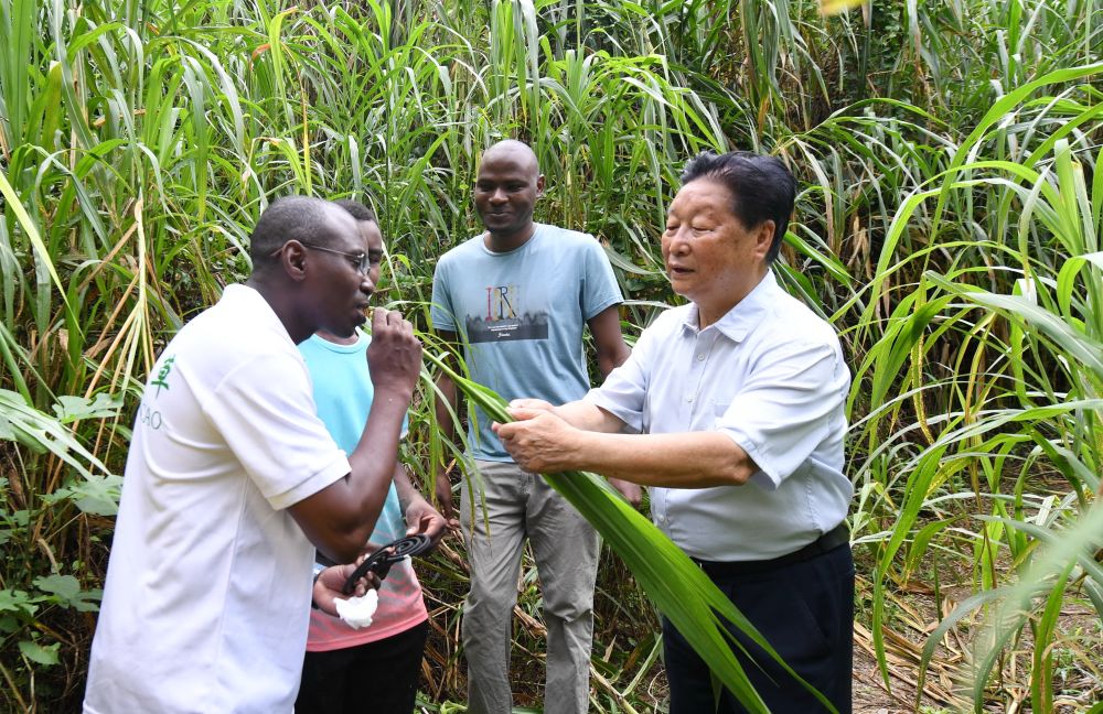 福建農(nóng)林大學(xué)國家菌草工程技術(shù)研究中心首席科學(xué)家林占熺(右一)在福建農(nóng)林大學(xué)菌草園讓尼日利亞留學(xué)生試嘗幼嫩菌草的味道(2021年8月12日攝)。新華社記者 林善傳 攝