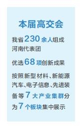本屆高交會(huì)以“激發(fā)創(chuàng)新活力 提升發(fā)展質(zhì)量”為主題,是史上規(guī)模最大、參與國(guó)家和地區(qū)最多的一屆高交會(huì)。作為高交會(huì)的“老朋友”,省商務(wù)廳組織230余人組成河南代表團(tuán),在全省優(yōu)選了68項(xiàng)創(chuàng)新成果,按照新型材料、新能源汽車、電子信息、先進(jìn)裝備、現(xiàn)代食品、現(xiàn)代輕紡、現(xiàn)代醫(yī)藥等7大產(chǎn)業(yè)集群分為7個(gè)板塊集中展示,并攜旭陽(yáng)光電、超聚變、力量鉆石、綠纖股份、未來星機(jī)器人等16家企業(yè)亮相。
