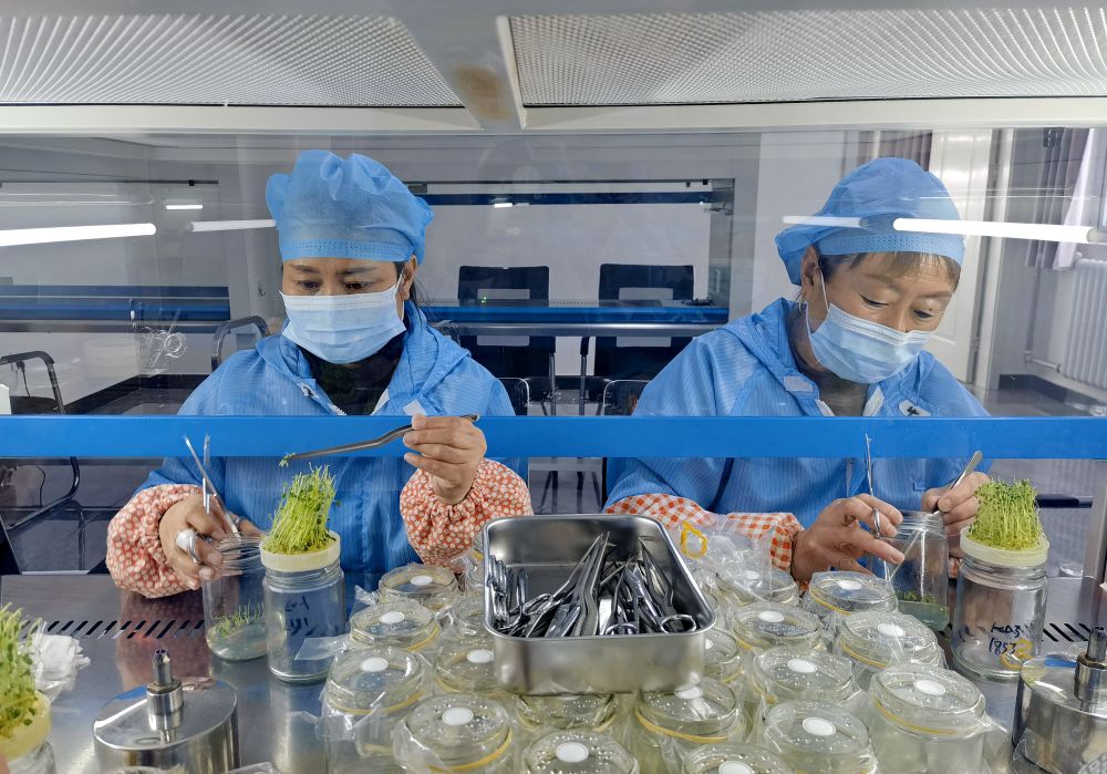 ??技術(shù)人員在河北省張家口市德勝村一處育種室內(nèi)培育微型馬鈴薯瓶苗(2024年2月4日攝)。新華社發(fā)