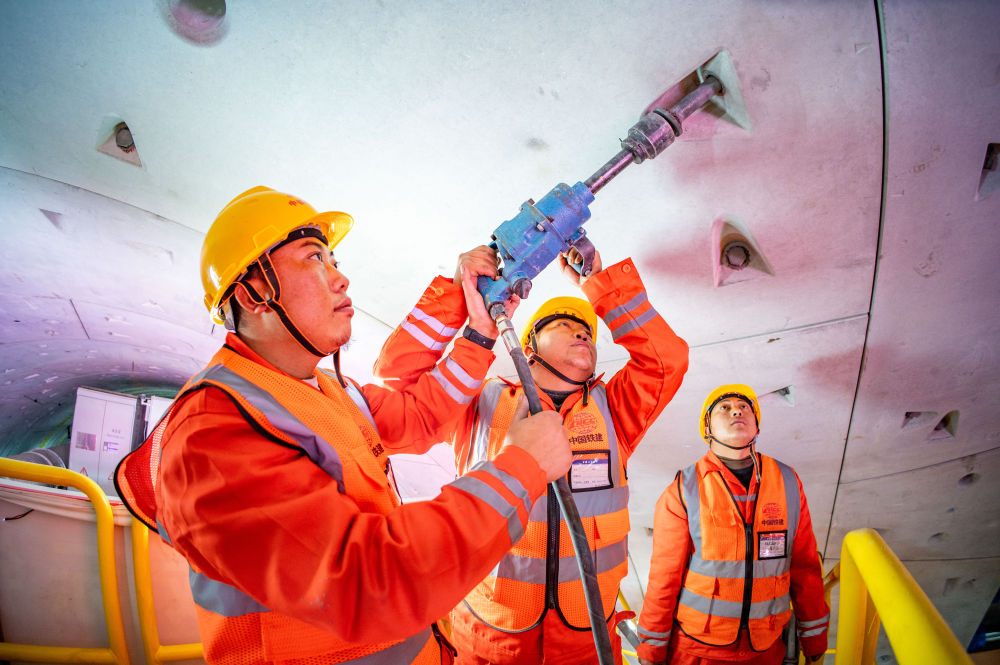 ??在中鐵十四局京唐城際鐵路運潮減河隧道內(nèi),施工人員在拼裝管片(2024年2月4日攝)。新華社發(fā)(中鐵十四局供圖)