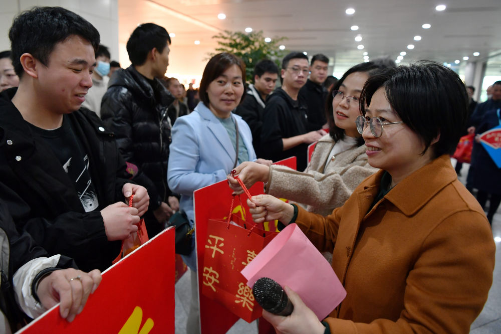 2024年2月15日,福州市人社部門工作人員(前右)向乘坐包機抵榕的返崗務(wù)工人員送上新春大禮包。當(dāng)日,來自云南、貴州的364名返崗務(wù)工人員乘坐的飛機降落在福州長樂國際機場。這是2024年春節(jié)后福州市人社部門通過免費包機接回的首批重點企業(yè)返崗務(wù)工人員。新華社記者 魏培全 攝