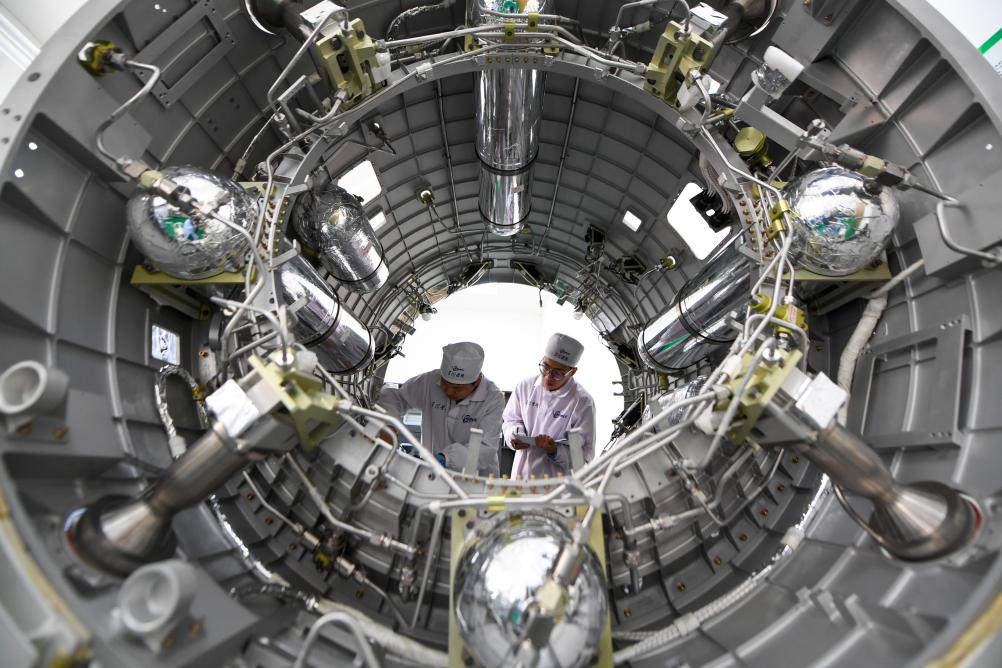 ??北京星際榮耀空間科技股份有限公司裝配測試人員在安裝液體姿軌控動力系統(tǒng)。
