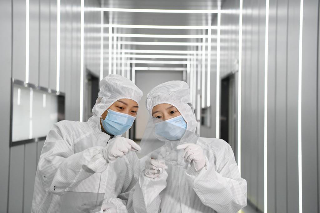 ??在東超科技工廠,技術人員檢查負折射平板透鏡原材料的品質。