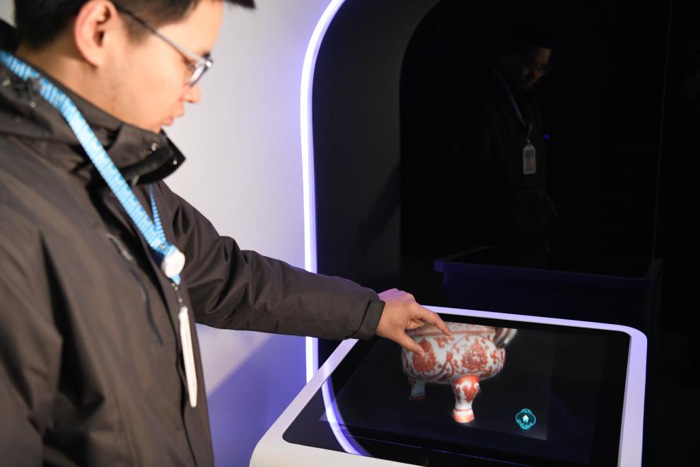 ??在安徽東超科技有限公司,工作人員演示空中成像互動查詢臺。