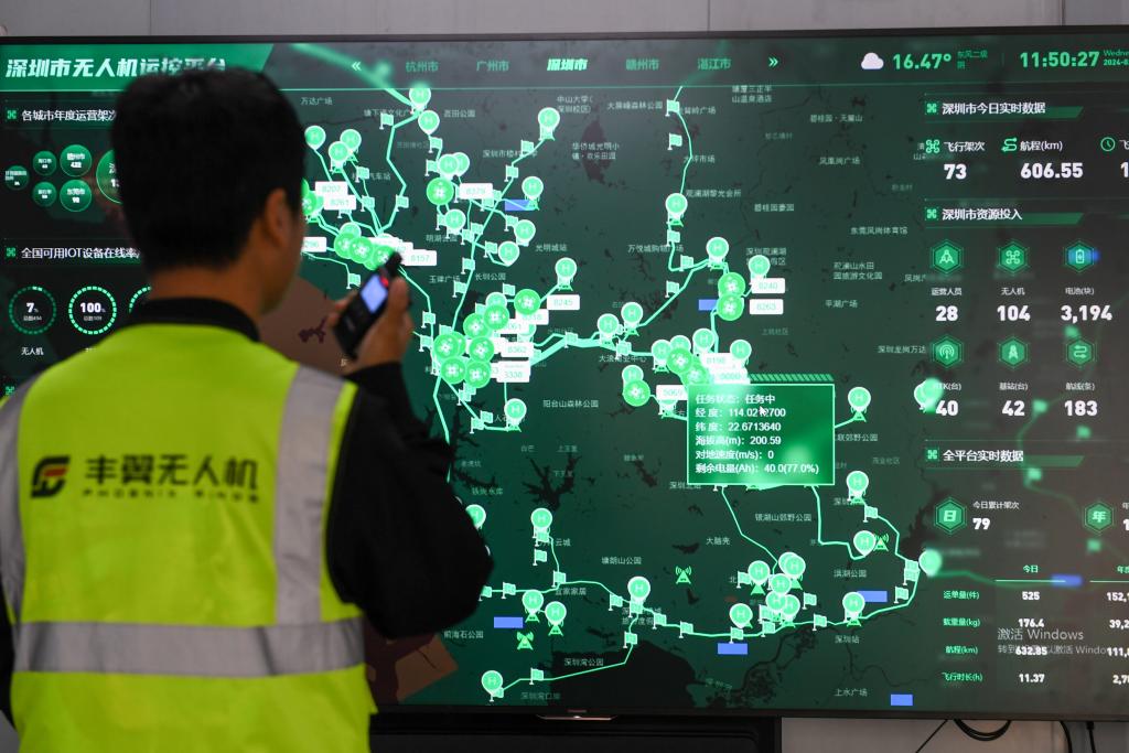 ??在豐翼科技(深圳)有限公司運營中心,機長對無人機進行調(diào)度。