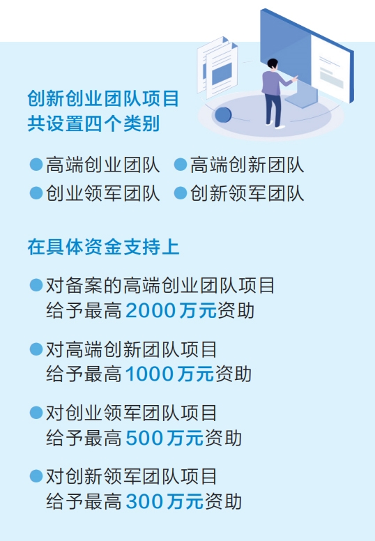 據(jù)介紹,創(chuàng)新創(chuàng)業(yè)團(tuán)隊(duì)項(xiàng)目共設(shè)置高端創(chuàng)業(yè)團(tuán)隊(duì)、高端創(chuàng)新團(tuán)隊(duì)、創(chuàng)業(yè)領(lǐng)軍團(tuán)隊(duì)、創(chuàng)新領(lǐng)軍團(tuán)隊(duì)四個(gè)類別。