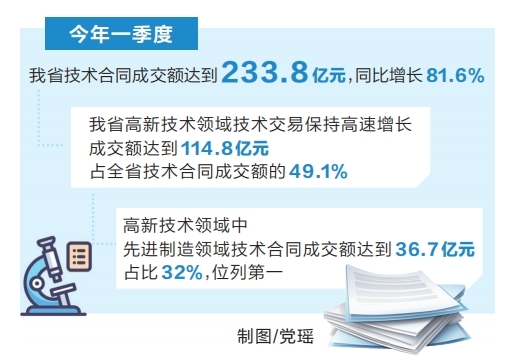 ??4月7日,記者從省科技廳獲悉,今年一季度,我省技術(shù)合同成交額達(dá)到233.8億元,同比增長81.6%。