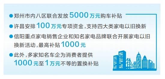 據(jù)了解,鄭州、開封等地及不少企業(yè)均開展了以舊換新促銷補(bǔ)貼活動(dòng)。其中,鄭州市內(nèi)八區(qū)聯(lián)合發(fā)放5000萬元購(gòu)車補(bǔ)貼;許昌安排100萬元專項(xiàng)資金,支持四大類家電以舊換新;信陽重點(diǎn)家電銷售企業(yè)和知名家電品牌聯(lián)合開展家電以舊換新活動(dòng),最高補(bǔ)貼1000元。此外,多家知名車企為消費(fèi)者提供1000元至1萬元不等的置換補(bǔ)貼。值得關(guān)注的是,此次以舊換新“綠意”十足。各大家電家居企業(yè)聚焦智能智聯(lián)產(chǎn)品推出優(yōu)惠活動(dòng);開封開展家電專項(xiàng)節(jié)能補(bǔ)貼活動(dòng),單件商品可補(bǔ)貼5%至20%。