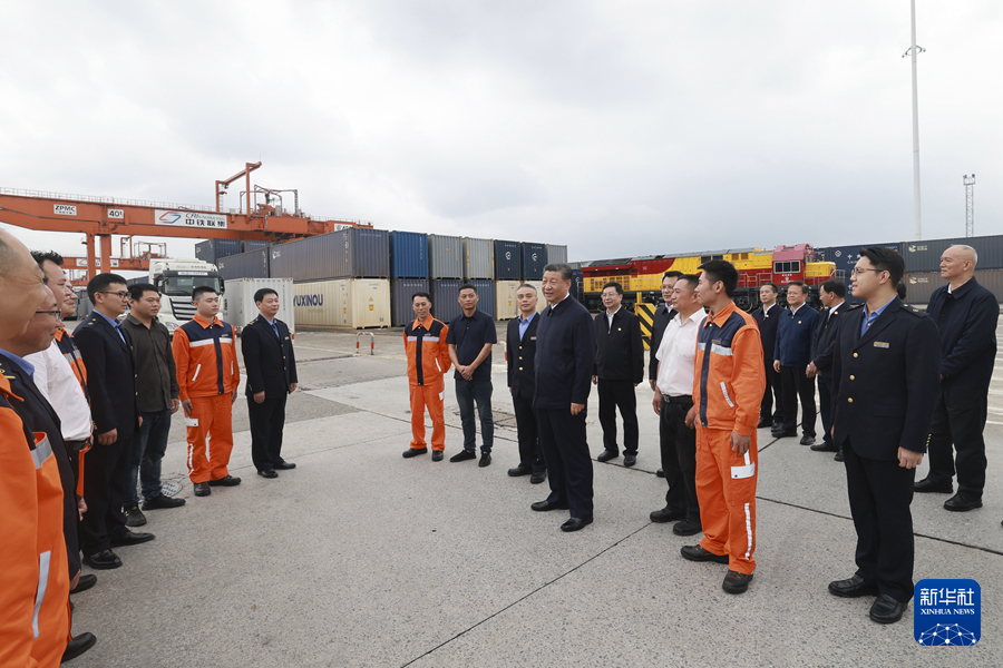 ??4月22日至24日,中共中央總書記、國家主席、中央軍委主席習近平在重慶考察。這是22日下午,習近平在重慶國際物流樞紐園區(qū)重慶鐵路集裝箱中心站,同貨車司機、列車司機、裝卸工人、場站管理人員等親切交流。新華社記者 岳月偉 攝