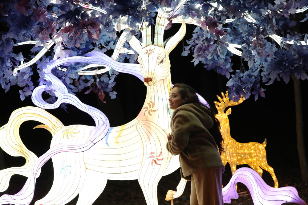 ??2023年12月14日,一名女子在法國巴黎風(fēng)情園舉辦的“山海有靈”法國豫園燈會上拍照留念。新華社記者 高靜 攝