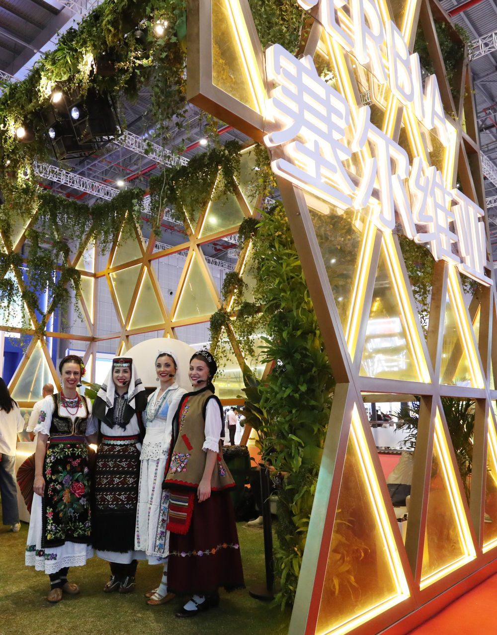??2023年11月6日,身著傳統(tǒng)服飾的演職人員在上海進(jìn)博會國家展塞爾維亞展臺迎接參觀者。第六屆進(jìn)博會國家展全面恢復(fù)線下舉辦,洪都拉斯、塞爾維亞、越南、南非、哈薩克斯坦作為本屆進(jìn)博會主賓國在國家展亮相。新華社記者 方喆 攝