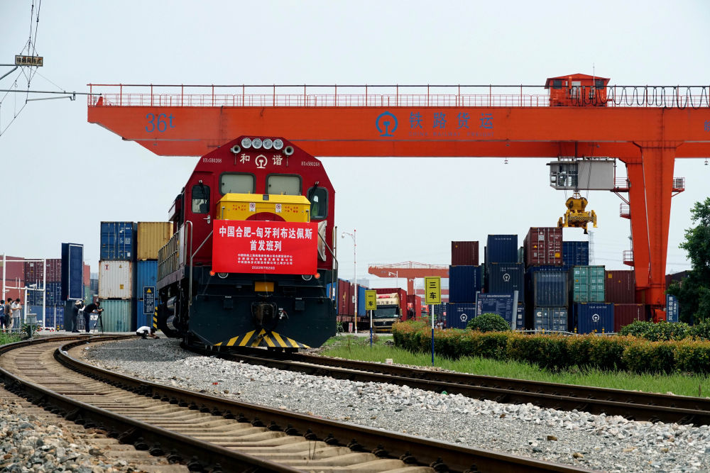 ??2022年7月29日,合肥至匈牙利布達(dá)佩斯的中歐班列從合肥北站物流基地駛出,標(biāo)志著合肥中歐班列通往匈牙利布達(dá)佩斯的線路正式開通。新華社發(fā)(席靜玉攝)