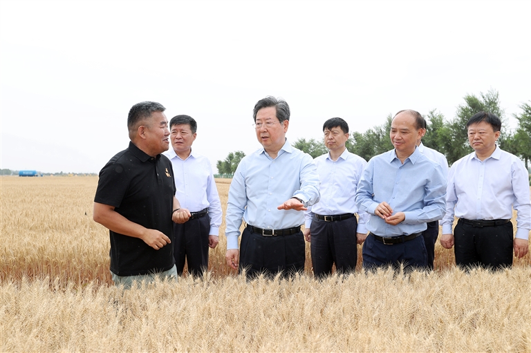 長葛市石象鎮(zhèn)的高標(biāo)準(zhǔn)農(nóng)田里,金色的麥浪起伏蕩漾,聯(lián)合收割機(jī)穿梭奔忙,一派燦爛豐盈的喜人景象。樓陽生走進(jìn)麥田、揉開麥穗,察看麥粒飽滿程度,與農(nóng)戶、農(nóng)機(jī)手親切交流,了解播種面積、麥?zhǔn)者M(jìn)度、收成收入等。他指出,春爭日、夏爭時(shí),要密切關(guān)注天氣變化,搶抓麥?zhǔn)沼欣翱谄?,加?qiáng)跨區(qū)機(jī)收組織調(diào)度,提升機(jī)械化、智能化水平,確保應(yīng)收盡收、顆粒歸倉。在河南鼎優(yōu)農(nóng)業(yè)科技有限公司,樓陽生走進(jìn)新品種展示中心,了解玉米、瓜果、蔬菜等新品種培育種植情況,鼓勵(lì)企業(yè)不僅要培優(yōu)種好新品種,還要往深加工走,拉長產(chǎn)業(yè)鏈、提高附加值。在聽取企業(yè)人才引育情況匯報(bào)后,他指出,發(fā)展現(xiàn)代農(nóng)業(yè)離不開一支高素質(zhì)農(nóng)業(yè)從業(yè)者隊(duì)伍,要加強(qiáng)產(chǎn)業(yè)扶持、政策支持,培育引導(dǎo)更多愛農(nóng)業(yè)、有知識、懂技術(shù)、善經(jīng)營的新農(nóng)人,投身農(nóng)村廣闊天地大展身手。