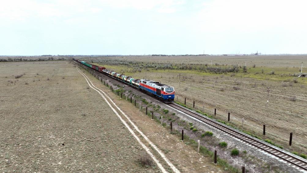 ??2023年5月12日,在哈薩克斯坦阿拉木圖附近,貨運(yùn)列車(chē)馳騁于阿拉木圖與中國(guó)霍爾果斯間(無(wú)人機(jī)照片)。新華社發(fā)(奧斯帕諾夫攝)