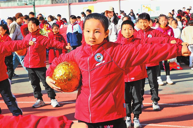 10月24日,焦作市解放區(qū)幸福街小學學生正伴隨著音樂跳自編的韻律操。自秋季新學期開學以來,該區(qū)開展形式多樣、內容豐富的特色體育教學活動,自編自創(chuàng)體育活動項目,讓學生們通過別樣的體育活動強健體魄。李良貴 攝