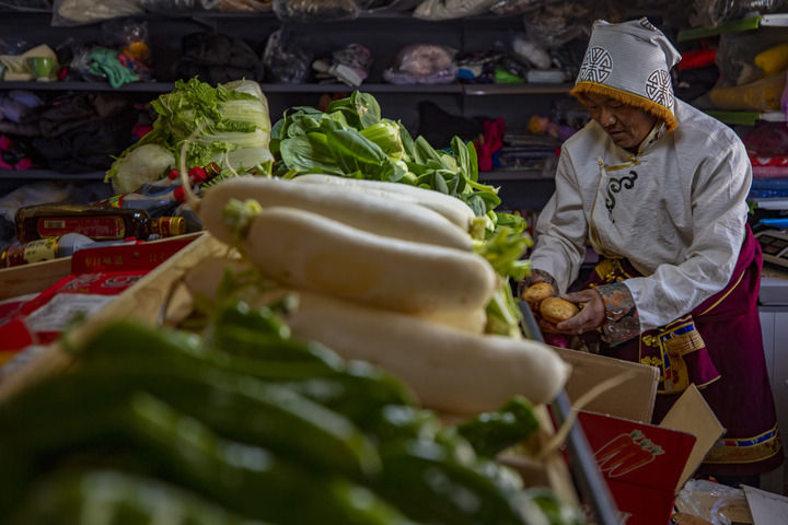 ??在西藏那曲市申扎縣馬躍鄉(xiāng)貝嘎四村偏遠(yuǎn)鄉(xiāng)鎮(zhèn)果蔬配送試點(diǎn)項(xiàng)目直銷點(diǎn),店主西熱加措在整理供銷合作社配送來(lái)的新鮮蔬菜(2024年1月5日攝)。新華社記者 姜帆 攝